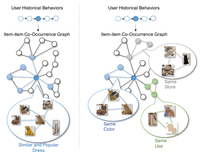 Standard CTR methods are biased towards the similar and popular items in the left figure. Triangle-based methods introduces different triangles as diverse interest units, such as skirts of the same color, store and use in the right figure. source.