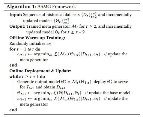To ensure that the meta generator is sufficiently trained before it can be deployed for online model generation, we perform π periods of meta generator warm-up training prior to the online deployment. During the online deployment phase, the meta generator will still need to be adaptively updated in order to keep up with the most recent sequential trends.