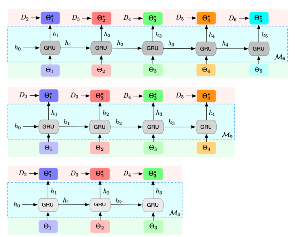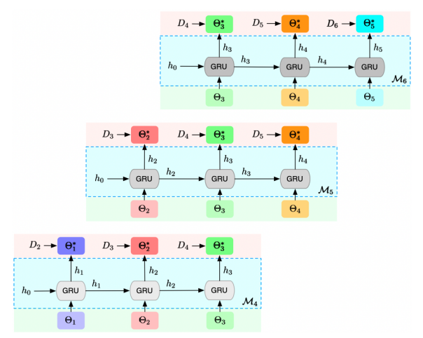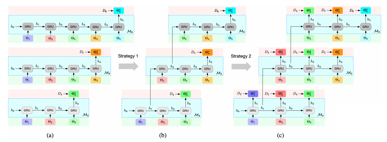 Training of GRU meta generator under the ASMG framework for three consecutive periods (i.e., training of M4, M5 and M6). Transition from (a) to (b) illustrates the first strategy, which trains the GRU meta generator on truncated sequence (here we use sequence length π = 3) by continuing on a previously learned hidden state. Transition from (b) to (c) illustrates the second strategy, which performs concurrent training by optimizing data at multiple steps, with greater weights assigned to the more recent data. ASMG-GRUsingle and ASMG-GRUmulti are depicted by (b) and (c) respectively.