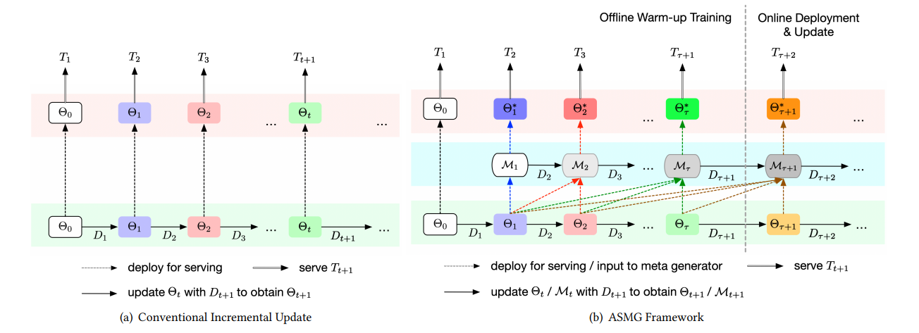 Now, we assume that mining the temporal trends exist in this sequence can have great potential in generating a better model for the next periodβs serving. Let denote the meta generator that takes in a sequence of models until , the output model used for serving is obtained by: