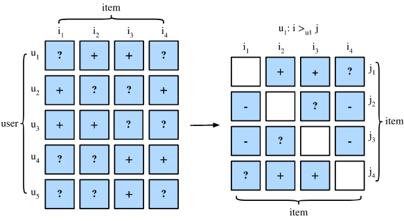 User has interacted with item but not item , so we assume that this user prefers item over . For items that the user have both interacted with, we cannot infer any preference. The same is true for two items that a user has not interacted yet (e.g. item and for user ).