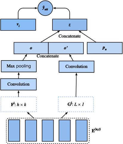 The main component of Caser consists of a horizontal convolutional network and a vertical convolutional network, aiming to uncover the union-level and point-level sequence patterns, respectively. Point-level pattern indicates the impact of single item in the historical sequence on the target item, while union level pattern implies the influences of several previous actions on the subsequent target. For example, buying both milk and butter together leads to higher probability of buying flour than just buying one of them. Moreover, users’ general interests, or long term preferences are also modeled in the last fully-connected layers, resulting in a more comprehensive modeling of user interests.