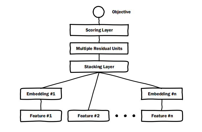 Manually crafted combinatorial features have been the “secret sauce” behind many successful models. For web-scale applications, however, the variety and volume of features make these manually crafted features expensive to create, maintain, and deploy. This paper proposes the Deep Crossing model which is a deep neural network that automatically combines features to produce superior models. The input of Deep Crossing is a set of individual features that can be either dense or sparse. The important crossing features are discovered implicitly by the networks, which are comprised of an embedding and stacking layer, as well as a cascade of Residual Units.