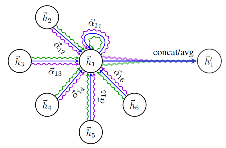 An illustration of multi-head attention (with K = 3 heads) by node 1 on its neighborhood. Different arrow styles and colors denote independent attention computations. The aggregated features from each head are concatenated or averaged to obtain .