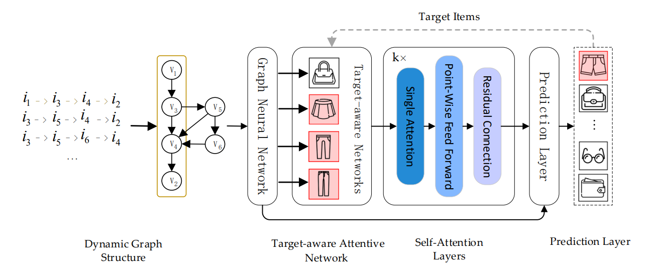 We first model user’s interaction sequences as session graphs which serves as the input of the graph neural network, and we can obtain each node vector involved in session graph via graph neural network. Next, target attentive network activates different user interests corresponding to varied target items adaptively (i.e., the learned interest representation vector varies with different target items). Then, we leverage the self-attention mechanism to accurately capture users’ long-term interests. Finally, we combine long-term and short-term interests to infer the probabilities for each candidate item for recommendation task.