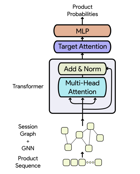 TAGNN-PP models item interactions with GNN, and both local and global user interactions with a Transformer.