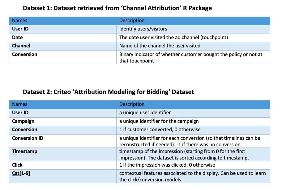 Criteo is a pioneering company in online advertising research. They have published this dataset for attribution modeling in real-time auction based advertising. This dataset is formed of Criteo live traffic data in a period of 30 days. It has more than 16 million impressions and 45 thousand conversions over 700 campaigns.