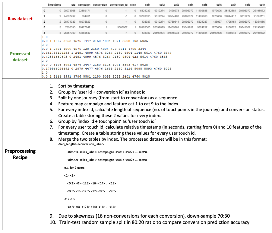 The impressions in this dataset may derive click actions so each touch point along the user action sequence has a label of whether a click has occurred, and the corresponding conversion ID if this sequence of touch points leads to a conversion event.