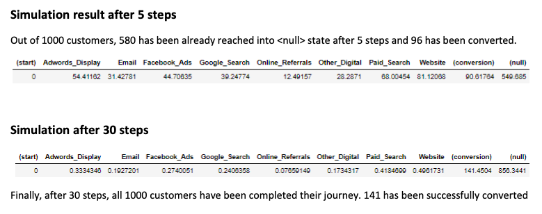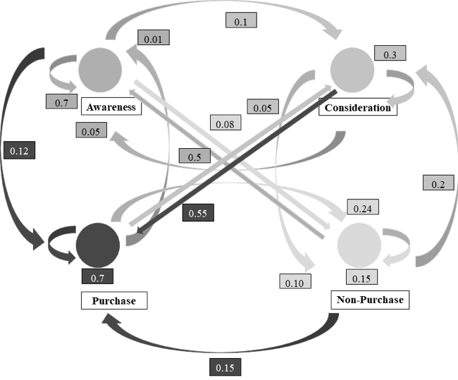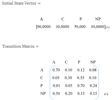 Assume that we need to know what the state the customer is after 6 months of launching the product. There are 200,000 customers which could be in any of the four states – Awareness, Consideration, Purchase, No Purchase. Final State of Customers = Initial State Vector * Transition Matrix